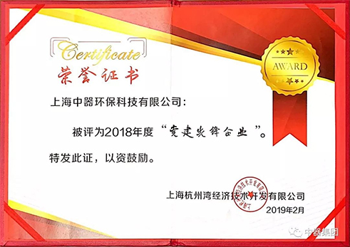 2018年6月,中共上海杭州灣經(jīng)濟技術開發(fā)區(qū)黨委授予上海中器環(huán)保科技有限公司黨組織“先進基層黨組織”稱號