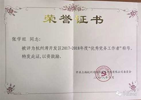 2018年6月,中共上海杭州灣經(jīng)濟技術開發(fā)區(qū)黨委授予中器黨支部書記張學旺“優(yōu)秀黨務工作者”稱號