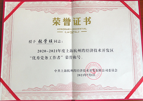 • 2018-2022連續(xù)5年上海杭州灣經(jīng)濟技術開發(fā)區(qū)黨委“優(yōu)秀黨務工作者”榮譽稱號